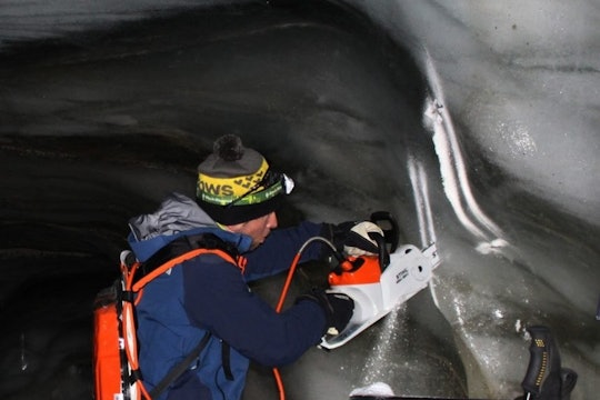 That’s where the physicists come in. Using technology developed to study quantum mechanics, researchers reduced the amount of ice they need to only one kg – a sample size easily acquired with a chainsaw and a sense of adventure. After carving out their samples in the glacier cave, the scientists pack them in a freezer and load them on a truck to be transported to Heidelberg University.